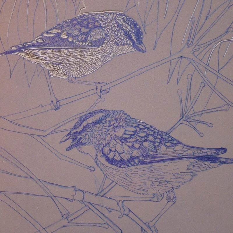 The image is drawn onto the lino surface in ball point pen (this won't wash off during cleaning). As this is a "reduction" print that uses just one block and a process of overprinting to produce a complete range of tones and colours, the size of the edition needs to be predetermined. It is also important to remember that the print will be reversed, especially if the composition includes text!
